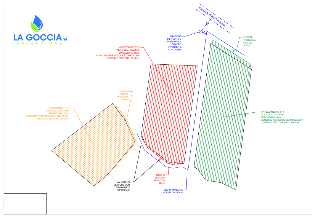 - Ripartizione dell’area in settori di irrigazione per ottimizzare il consumo dell’acqua e del tempo di irrigazione.